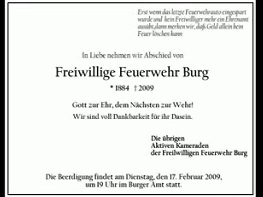 Diese "Todesanzeige" stellten Mitglieder der FF Burg ins Internet. Foto: Internet