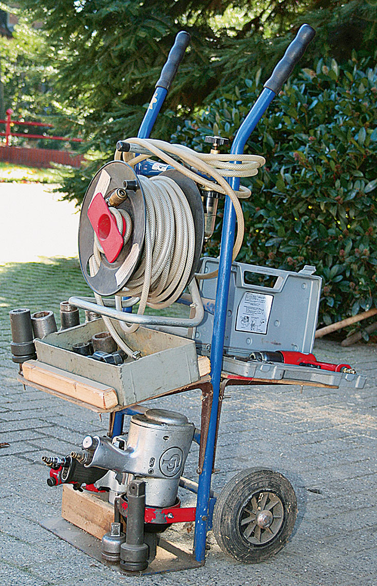 Robuste Regale sind mit Winkeleisen an die Sackkarre geschraubt, so erstellen Sie eine handliche mobile Werkbank für Luftdruck-Werkzeuge.